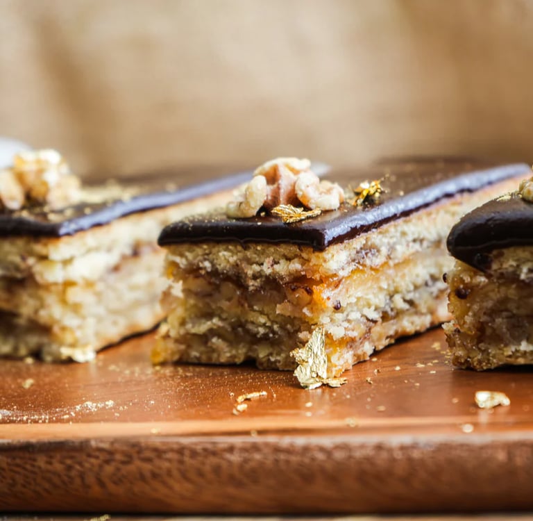 The house signature. A divine stack of yeast dough, ground walnuts, and apricot jam, topped with a chocolate glaze. It's Hungary on a plate—bold, nutty, a little tangy and unapologetically rich.
