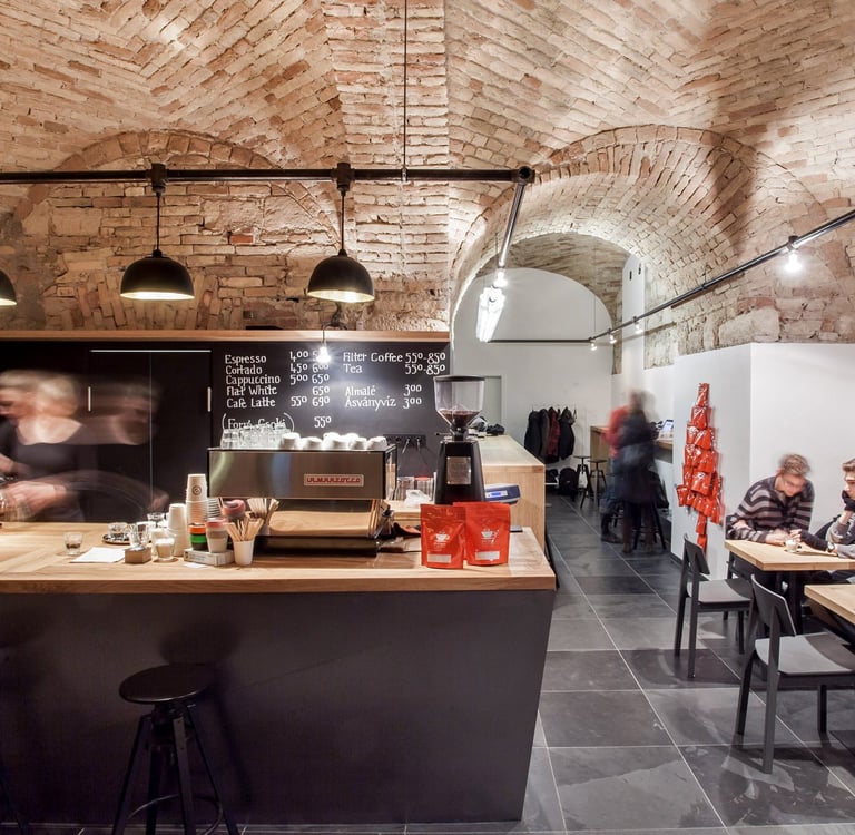 Espresso Embassy stands as a founding pillar of Budapest’s third-wave coffee culture, notable for being one of the earliest cafés to elevate bean quality, brewing precision, and ethical sourcing in the city. Established in 2012 by barista champion Tibor Várady and his partner, the café was part of a decisive shift away from commodity espresso toward specialty methods like V60, Chemex, and AeroPress. Set within a classicist urban palace dating from the early 19th century, the interior retains original stone-brick vaulted ceilings and bohemian mixed-texture walls uncovered during renovation. Sporaarchitects transformed the space by pairing raw historic surfaces with minimalist oak-steel furnishings, water-pipe lighting, and a copper tap that guests use to refill filtered water. It was conceived not just as a café but as a cultural hub, where students, professors, creatives, and travelers intersect over single-origin brews and locally roasted beans. Espresso Embassy remains true to its founding vision—craft-focused coffee, community building, educational hospitality, architectural authenticity, and sustainability ethos.