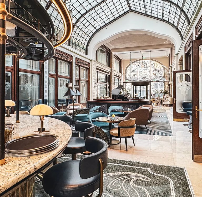 Gresham Palace is home to KOLLÁZS French Brasserie & Bar and MÚZSA, an elegant cocktail lounge. Kollázs offers refined French-Hungarian cuisine in a setting overlooking the Chain Bridge and Danube, where dishes combine locally sourced ingredients with classical techniques. Breakfast is served in a sunlit atrium space that evokes café tradition while offering polished service. MÚZSA lounge, set under stained-glass ceilings, serves signature cocktails that highlight Hungarian flavors—like sour cherry highballs—and occasionally hosts performances such as first-Thursday tango evenings. Both venues emphasize culinary delight married to historic ambiance, inviting guests to linger over meals, wine, or cocktails in settings that feel timeless yet energized. Staff members attend to detail—from menu recommendations to pairing suggestions—ensuring that each sip and bite is part of the curated Gresham experience.
