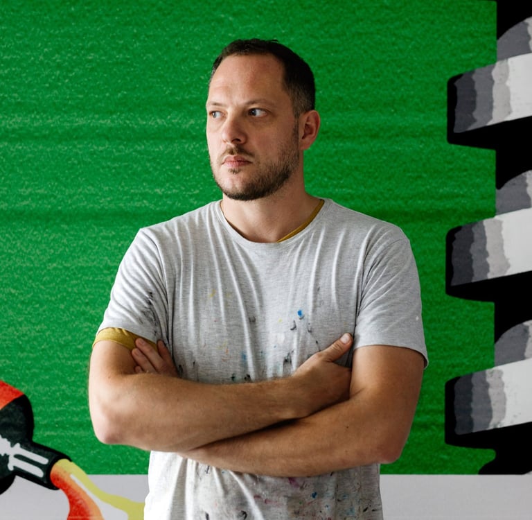 Róbert Batykó was born in 1981 in Miskolc and established himself as one of Hungary’s most distinctive artists rising from the mid‑2000s generation. He earned his Master’s in Painting from the Hungarian University of Fine Arts in Budapest under the mentorship of Károly Klimó, followed by a Doctor of Liberal Arts degree in Pécs. From the beginning, Batykó explored how digital image culture collides with traditional painting methods. His work surfaces as a conversation between analogue brushwork and the detritus of consumerism—vector illustrations, packaging, found objects—refined into monumental canvases. He developed his own scraping machine combining press and blade, enabling him to lay on paint and then remove it, in a controlled yet unpredictable gesture that leaves behind ultra-thin, layered surfaces. These processes reflect an acute awareness of image formation, memory, and technological residue—making each painting a visual autobiography of image culture and analog resistance.